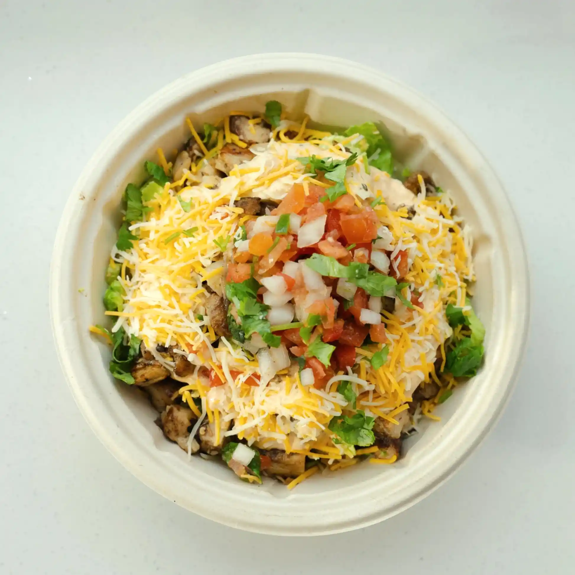 Seasoned Rice, Jerk Chicken, Corn, Shredded Cheese, Pico De Gallo, Greens, Grilled Onions, topped with Chipotle Sauce.