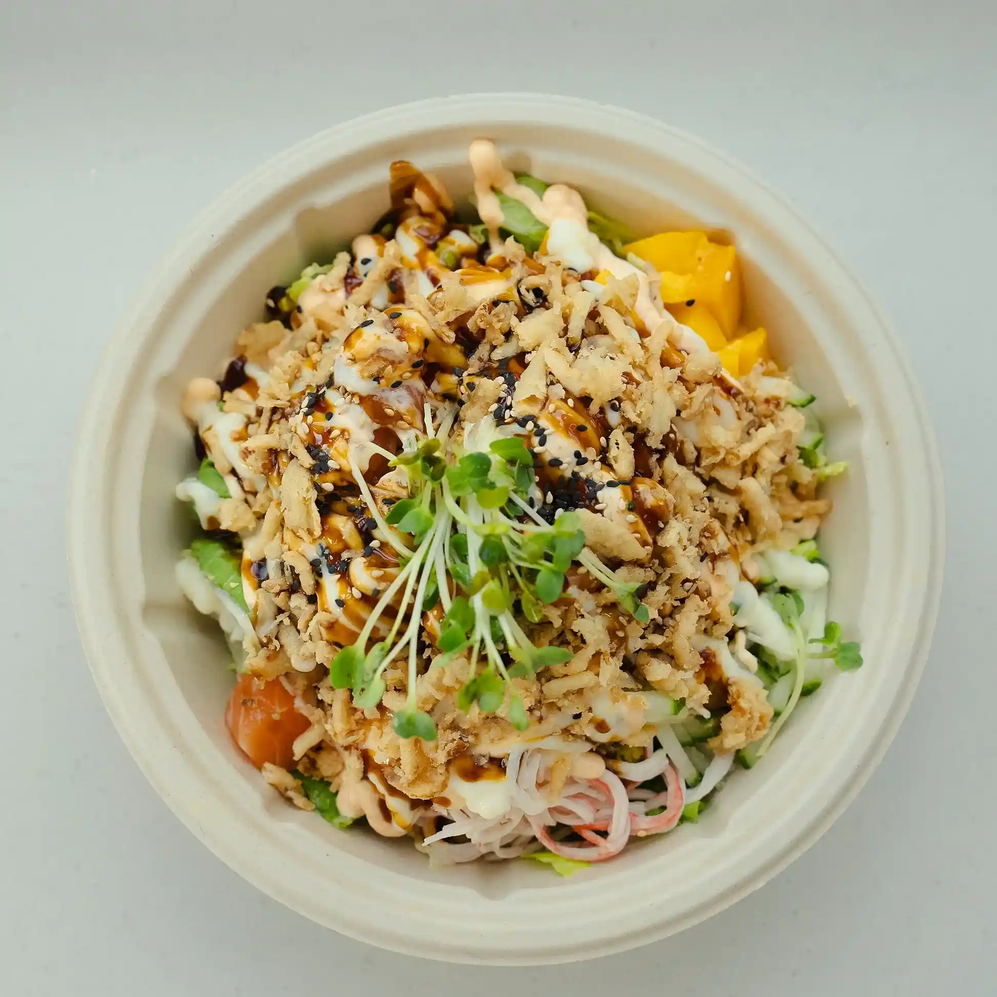 Seasoned Rice, Salmon, Lettuce, Avocado, Cucumber, Mango, Masago (fish roe), Fried Onions, topped with Honey Mayo, Sriracha Aioli, and Poke Sauce.
