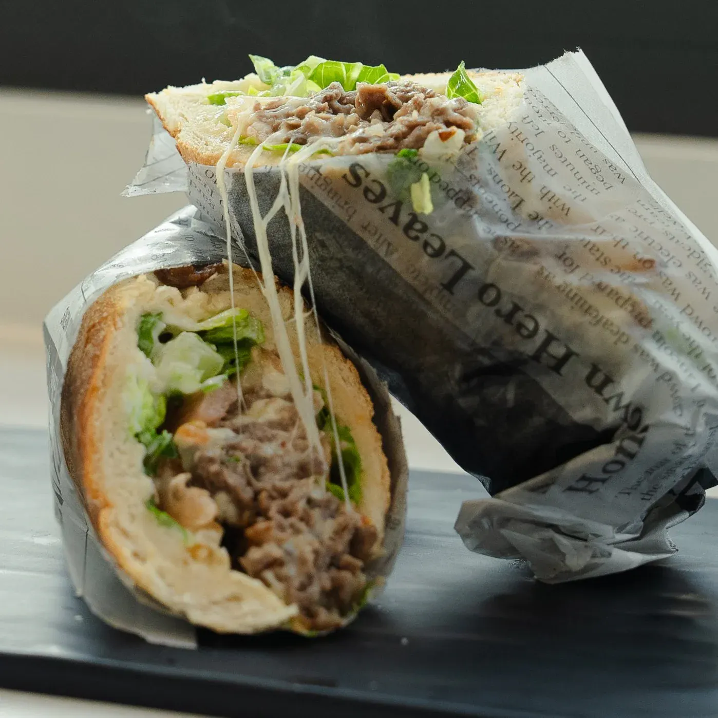 Seasoned thin sliced Rib-eye Steak, Grilled onion, Provolone, Lettuce, Tomato, Mayo on Sub
