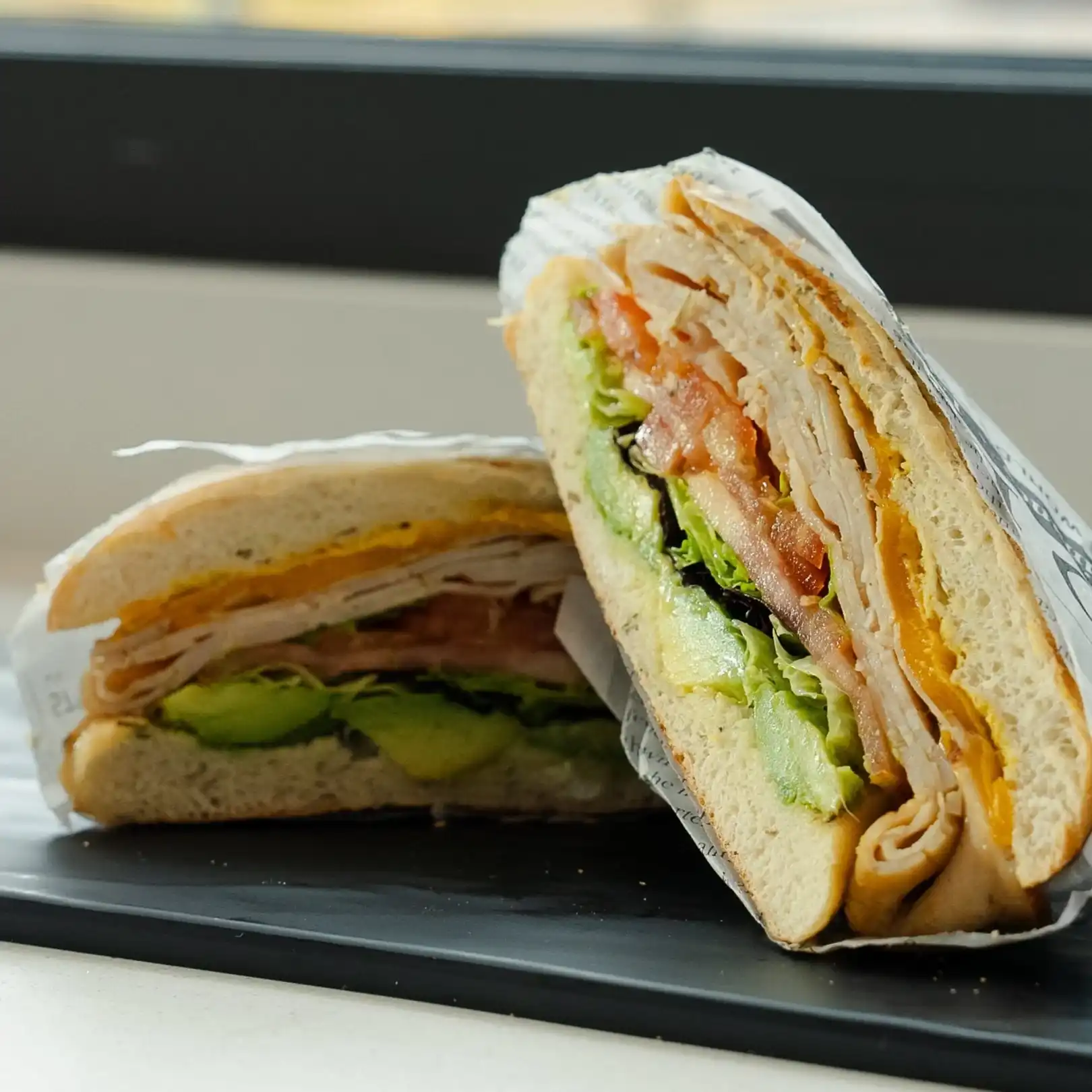 Smoked Turkey Breast, Avocado, spinach, Tomato, cheddar, dijon Mustard on Foccacia